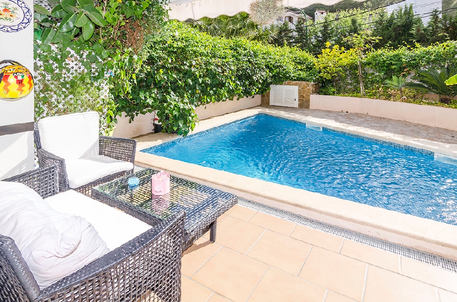 | This ground floor is located in the residential area of San Agustín, at only few minutes of the commercial area and the Cala Nova marina and beach. It is well connected to the motorway and to the centre by various bus lines. It is situated in a small building built in year 2.000. It is very light. facing East-West. it consists of living/ dining area with direct access onto the pool area- with salted water - and terraces. It has a master bedroom with en suite bathroom, with jacuzi, and two more double bedrooms plus another bathroom. The equipped kitchen leads directy onto a nice patio and laundry area. It has a spacious storage room in the basement and a parking space beside the entrance of the flat. Other features: 4 air con h/c units, electric shade, marble floors. | |||||||||||||||